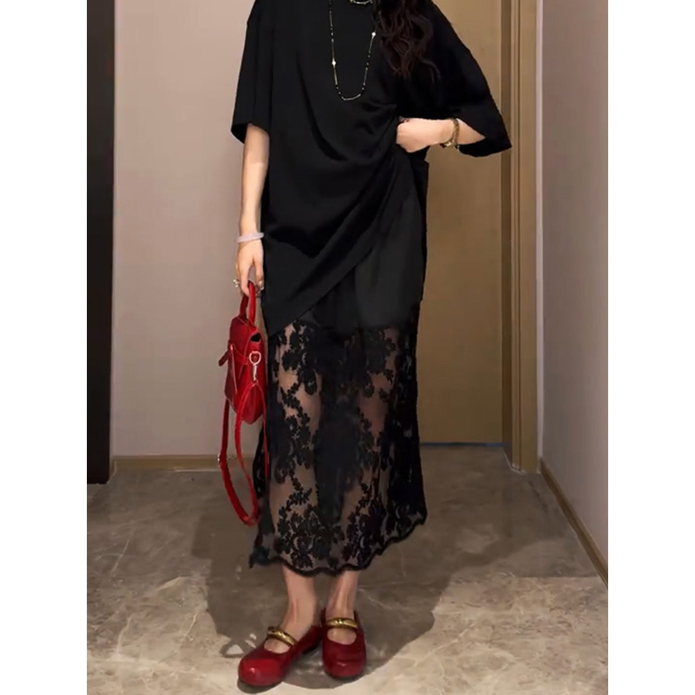 フレンチレーススプライシングスカート女性のための 2025 夏の新しいスタイルの弾性ウエスト痩身多用途黒気質ミドル丈スカート