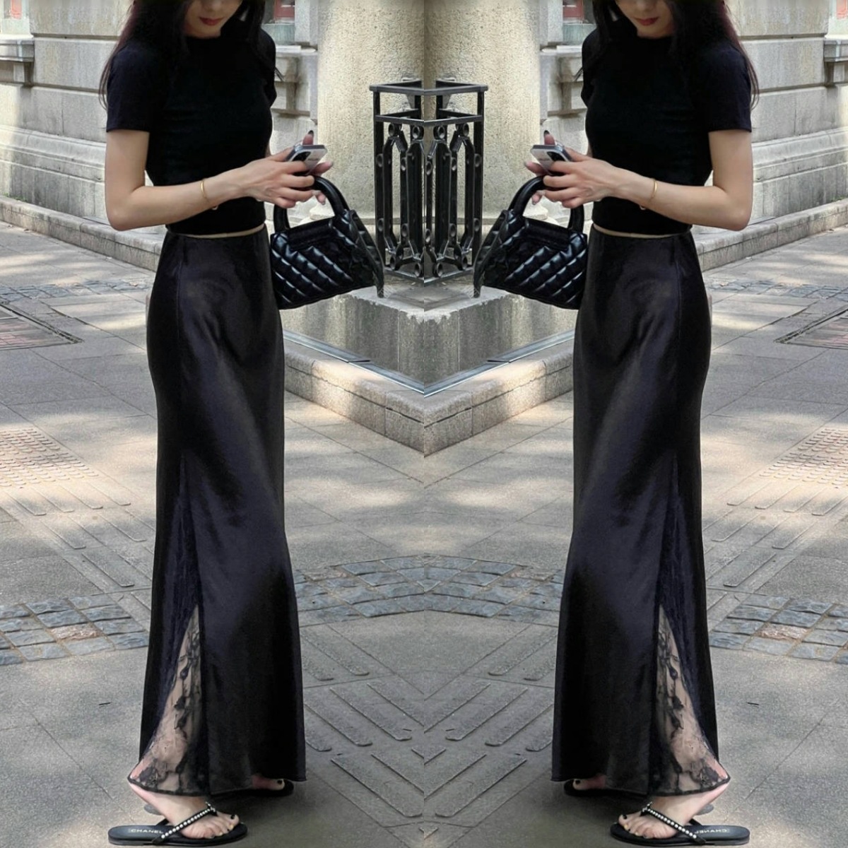 フランスの高級レースステッチアセテートブラックスカート女性の夏のハイウエストスリムミドル丈サテンスカート