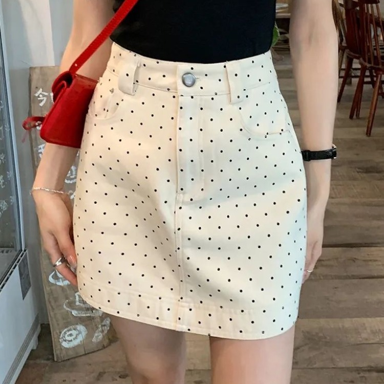 ホワイトスカートデニムスカートレディース2025年夏新作トレンドスリムフィットヒップカバーアラインスカート水玉ショートスカート
