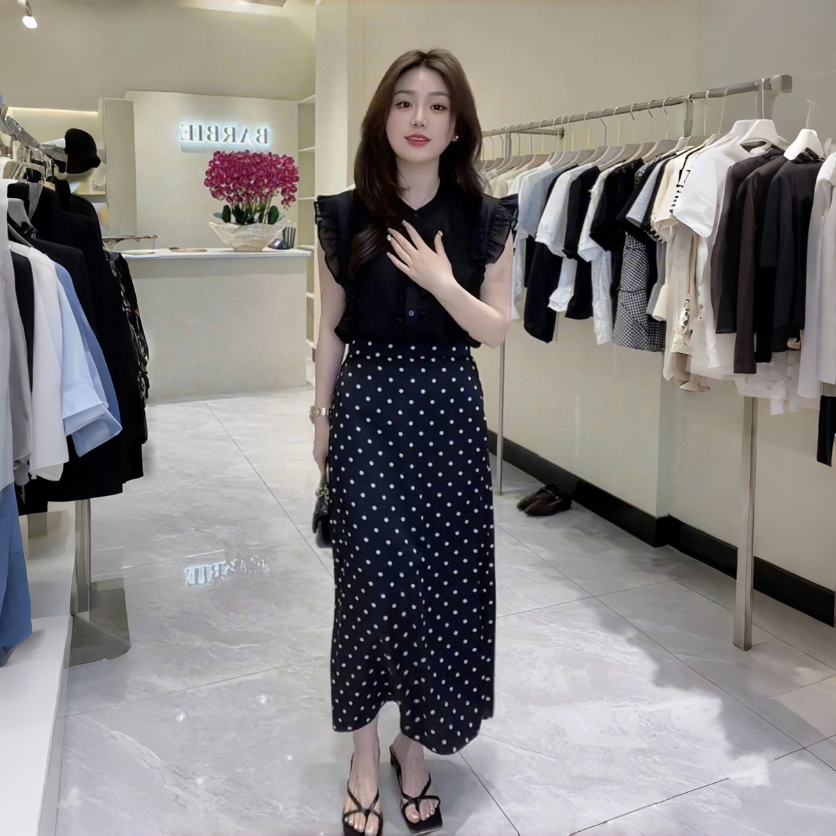 ヨーロッパのファッショナブルな弾性ウエスト水玉プリントスカート女性のための夏の新しいスタイルの年齢を軽減する多用途スリットミドル丈スカート