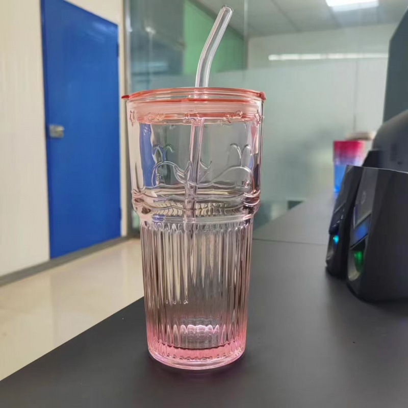 風墨グリーン女性コーヒーカップ高颜値グラスストロー付き大容量カップ