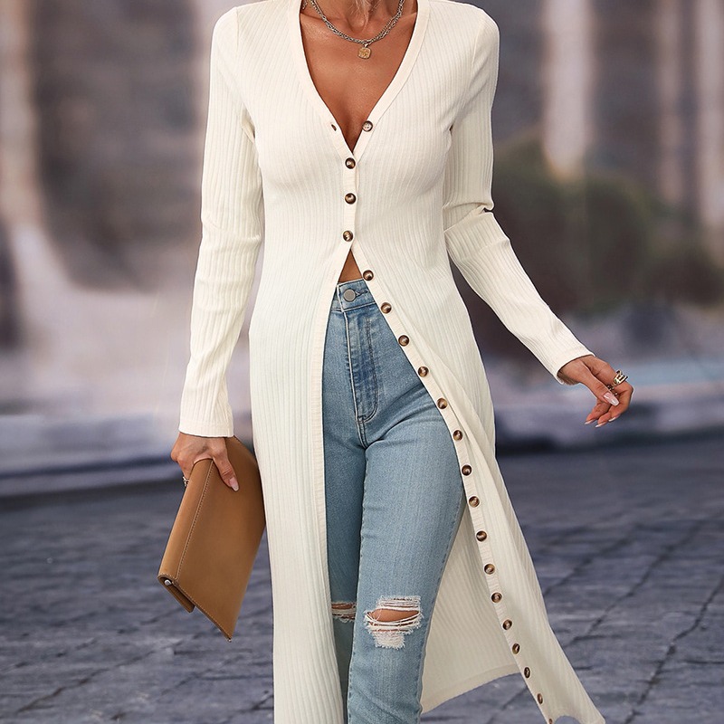 2023新型アマゾン速売通純色ボタンの長い穴の薄いコートの開襟ワンピース