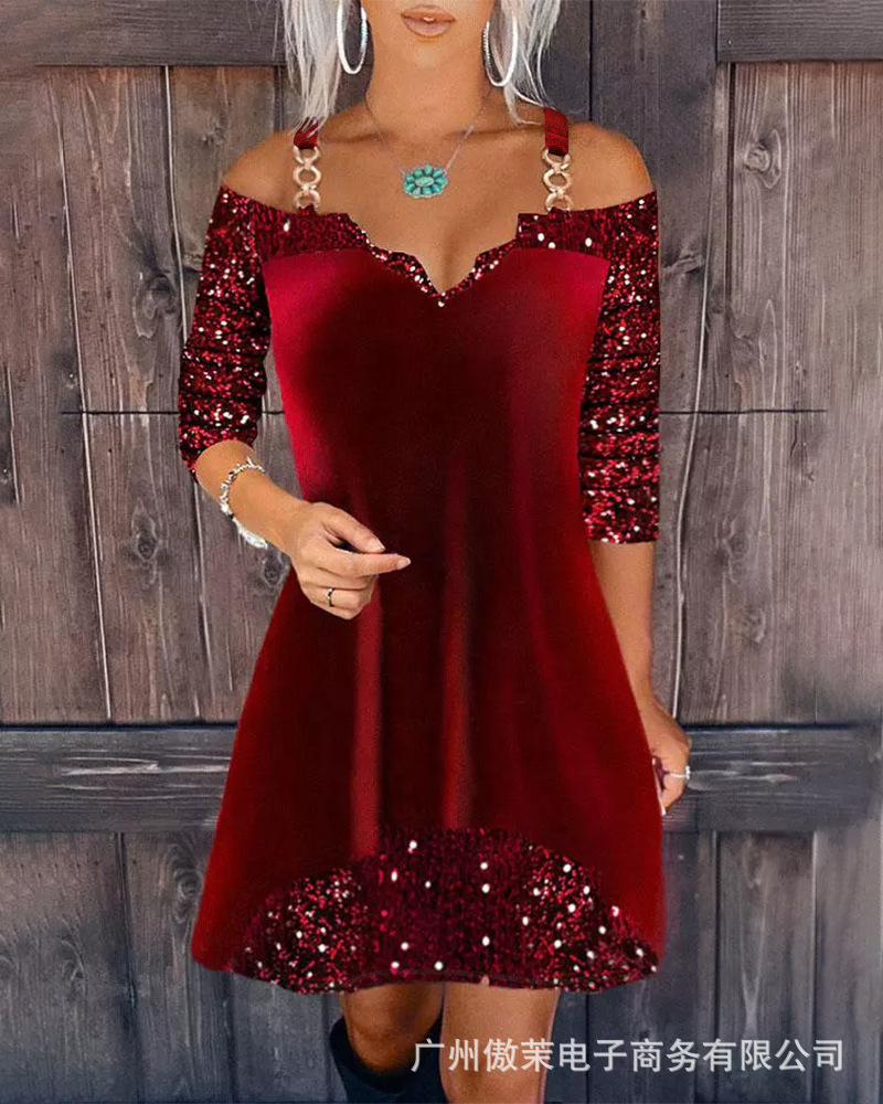 2023現物欧米女装ファッション新型アマゾンのスパンコールはベルベットのしわワンピースをつなぎ合わせた