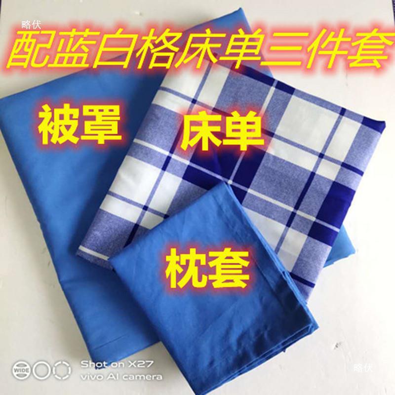 【厚手モデル】学生寮 シングルベッド ピュアブルー 青と白のチェック柄 掛け布団カバーとシーツの3点セット