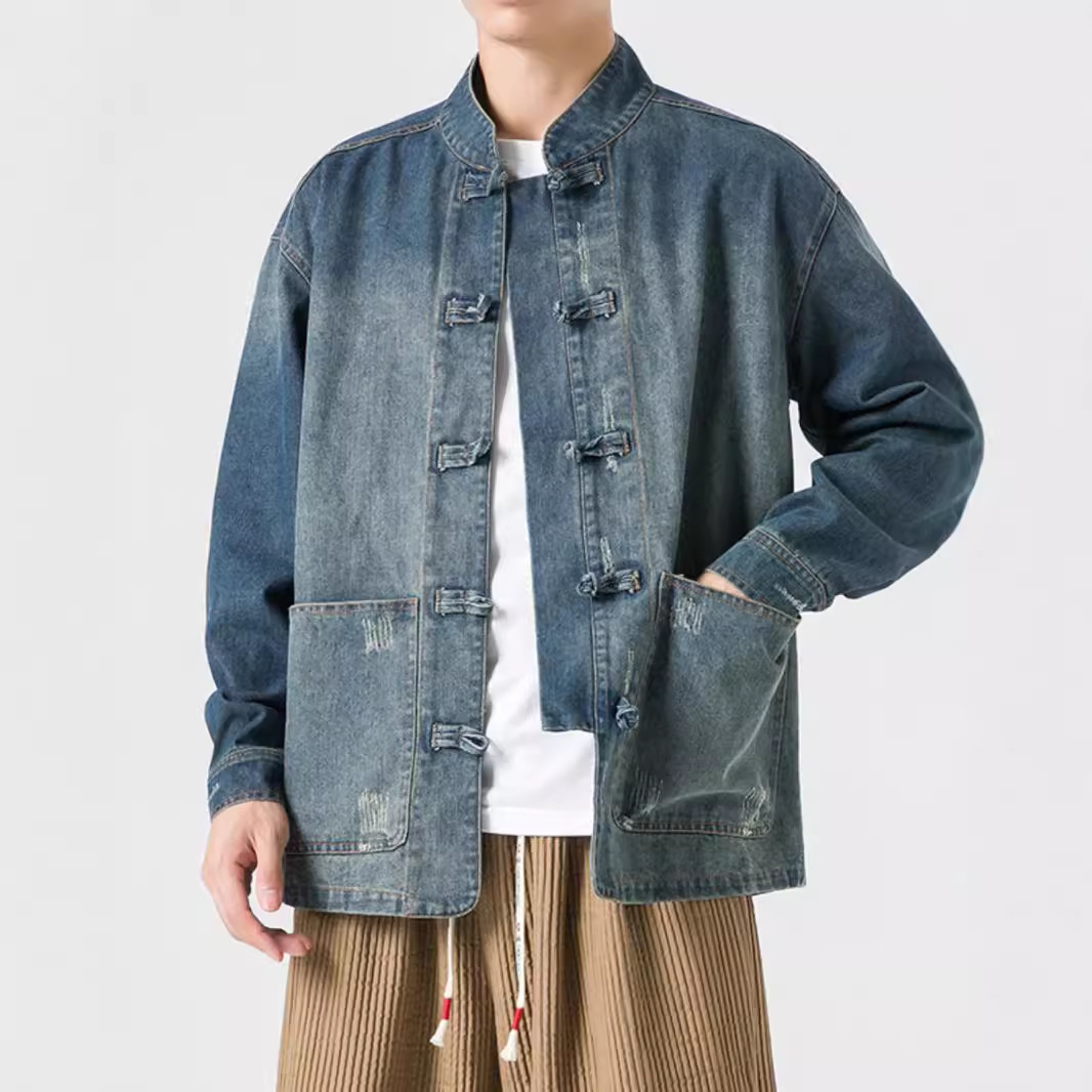 デニムのジャケットのグラデーション色の水洗いデニムのジャケットの男性は古いコートをして唐の装飾を改良します。