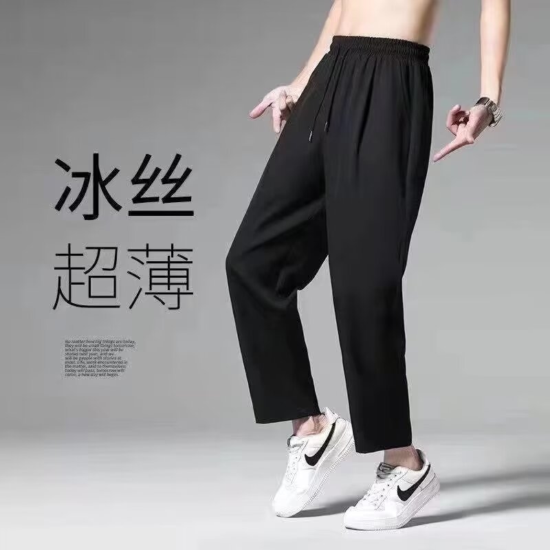 氷糸網眼運動ズボン男性カジュアルパンツ透かし彫り夏超薄束足糸滑りゆったりエアコン九分ズボン