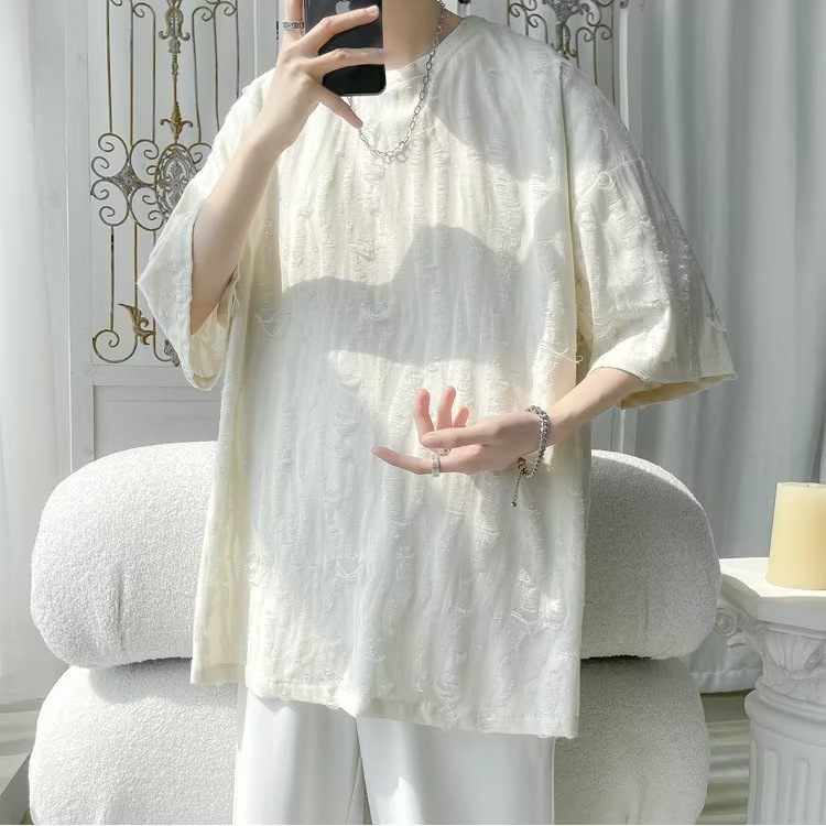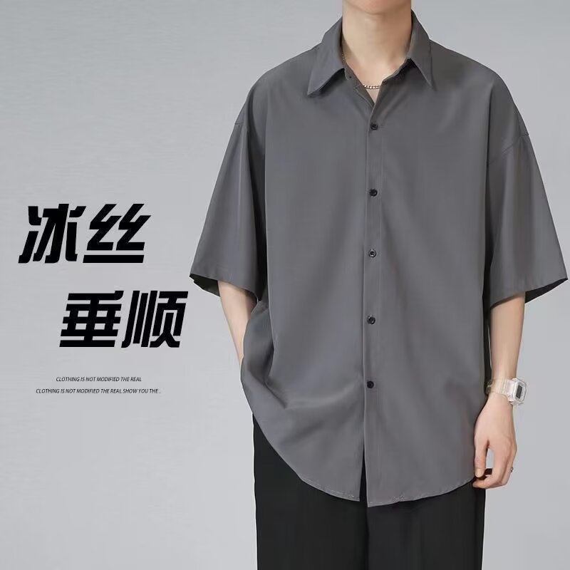 香港風高級感垂感氷糸七分袖シャツ半袖男性デザイン感がゆったりしています。