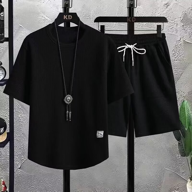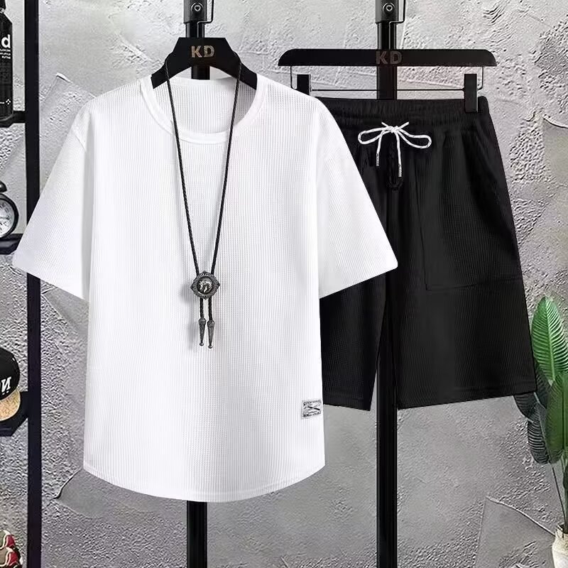 ワッフルカジュアルスポーツスーツメンズ夏半袖ショートパンツ2点セットゆったり大きいサイズ青少年ファッションかっこいい