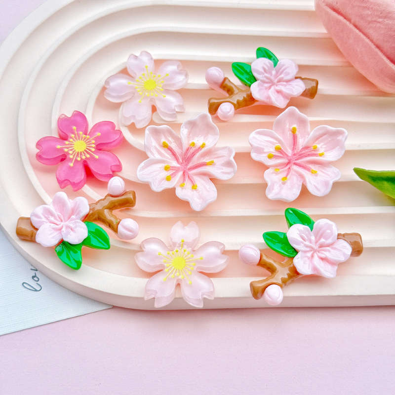 桃の花シリーズの樹脂diyアクセサリーの携帯ケースの穴の靴の貼り付けの髪飾りの材料の卸売りをシミュレーションします。