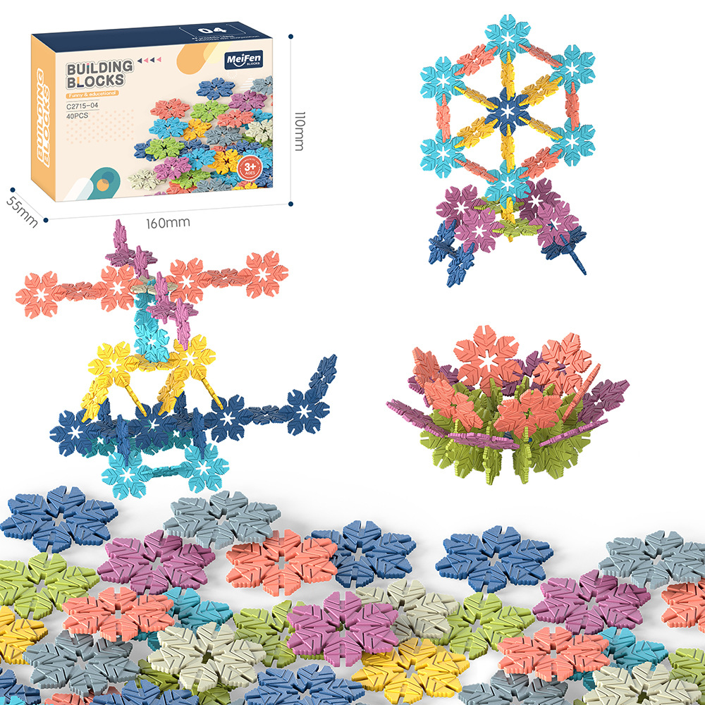 子供の創意は積み木のおもちゃの木の葉の金の雪の切れの幼稚園の贈り物をつづり合わせます。