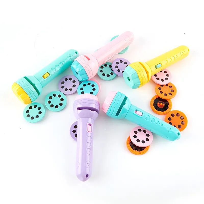 子供の投影懐中電灯が光る寝る前におもちゃを教えています。