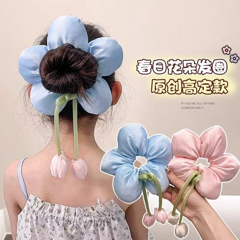 チューリップの花柄ヘアゴム、子供用お団子ヘア、ロープニーハイ、髪を傷めないヘアゴム、綿入りヘアアクセサリー、花柄ヘアゴム
