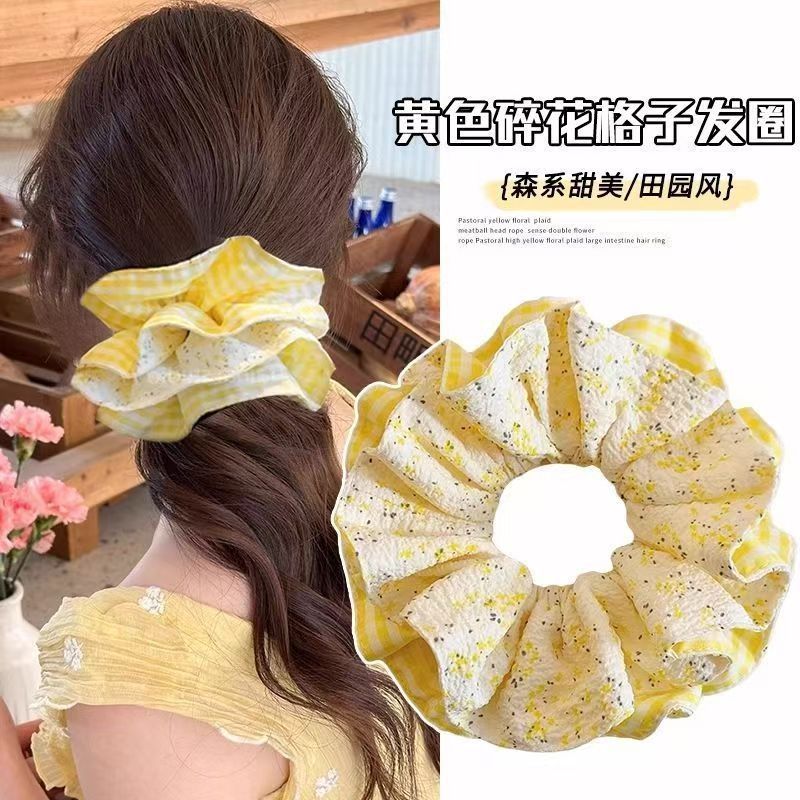 森風チェック柄花柄ヘアゴム、爽やかな田園風二層ボールヘッドバンド、高級気質ヘアゴム