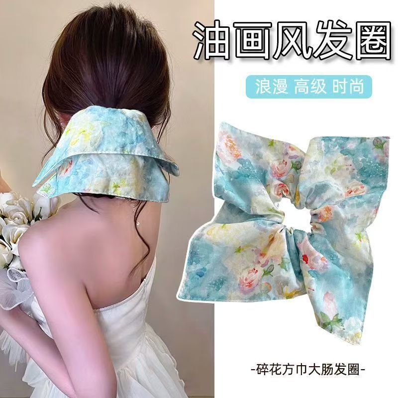 油絵花柄スクエアスカーフ、レイジースタイルヘアゴム、高級おしゃれヘアロープ、ヘアゴム、美しいスクエアヘアアクセサリー
