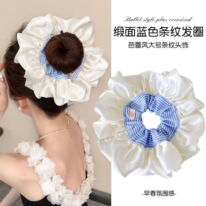 韓国風クリームサテンバレエ風ヘアゴム、大きなブルーストライプヘッドバンド、甘いプリンセス風ヘアロープ