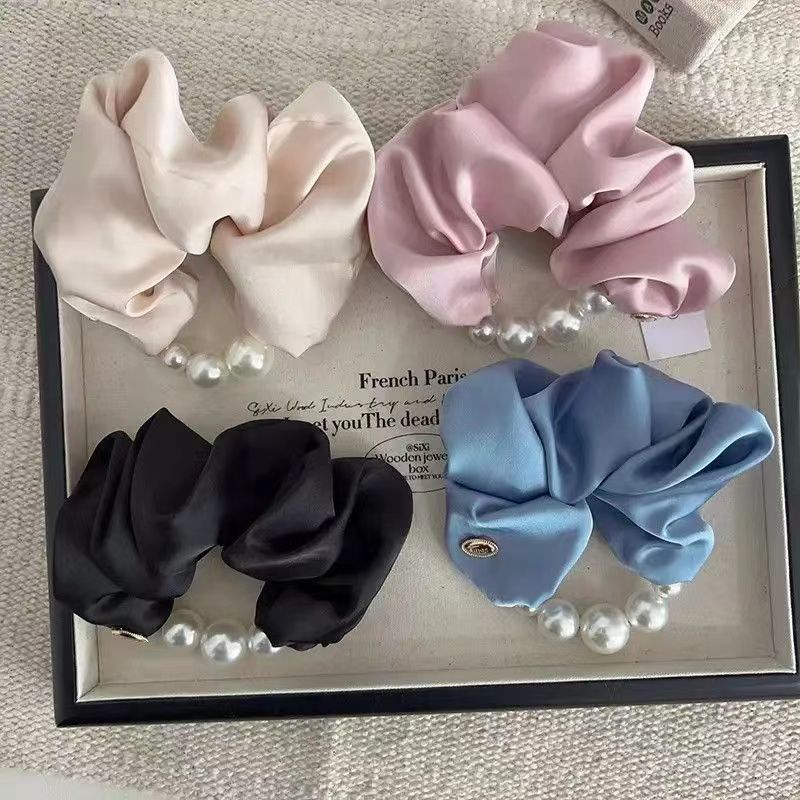 サテン生地の韓国風パール付きヘアゴム、女の子向けローポニーテール用ヘアゴム、万能なヘアゴム、髪を傷めない