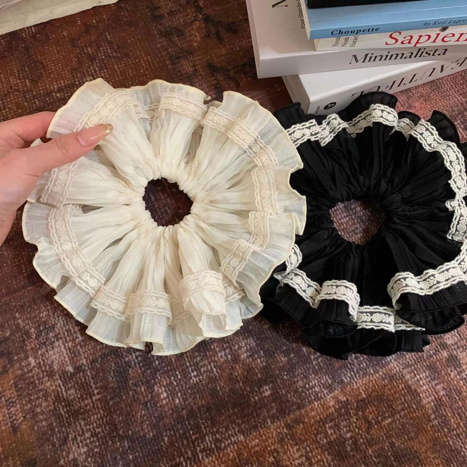 レースのフリルが付いた大きなヘアゴム、高級感のあるポニーテール用、大きめサイズ、おしゃれで万能なヘアアクセサリー、高弾性