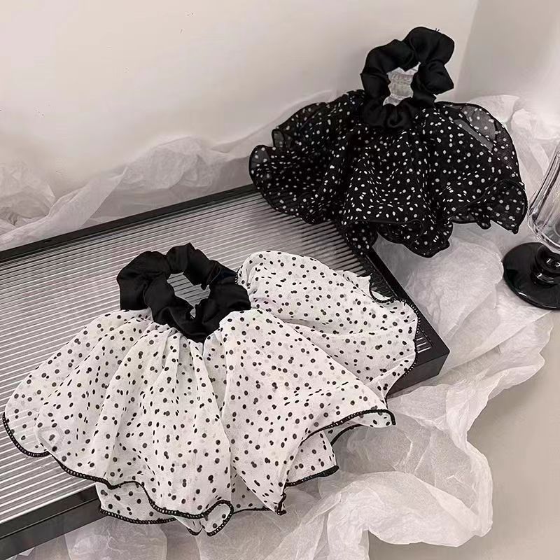 黒と白の水玉模様の二重メッシュのシンプルなプリーツスカートヘアゴム、ポニーテール用、高弾性、春向け