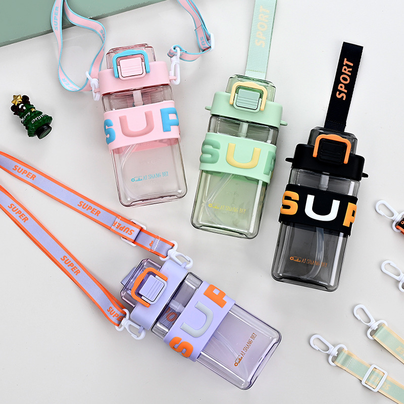 水杯方形儿童学生上学专用太空杯运动水壶耐热带提绳大容量吸管杯