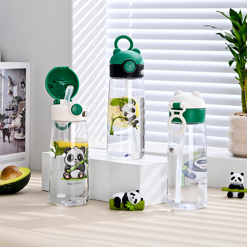 夏日三色卡通熊猫水杯弹跳杯塑料水杯带吸管耐高温运动水杯户外