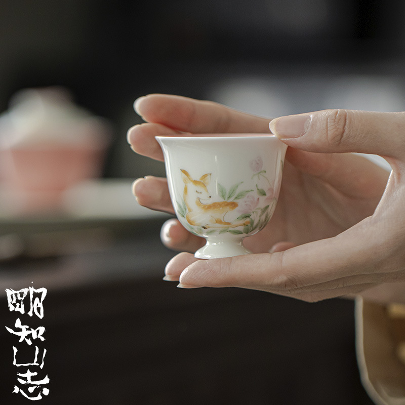 明知山志手描き小鹿癒し系茶杯文人家庭用工夫茶具単杯内釉薬品茗杯