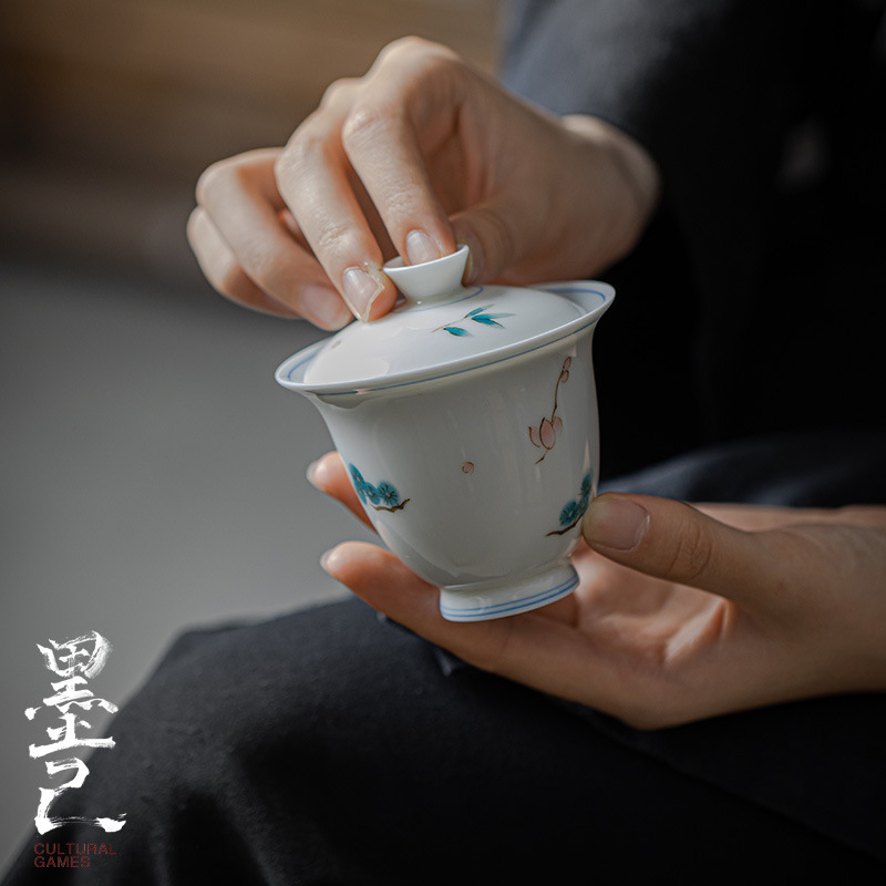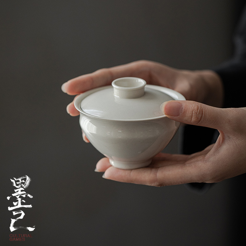 墨己玉泥手描き高足蓋碗薄胎陶磁器泡茶碗文人雅植家庭用白磁蓋碗