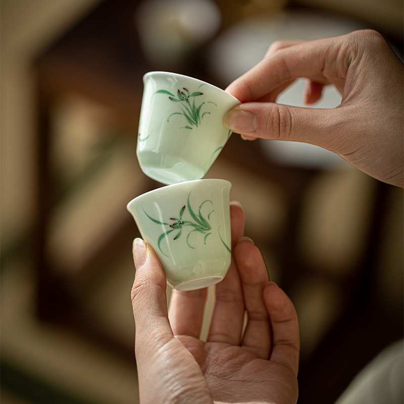 墨己玉泥粉彩蘭品茗杯工夫茶器陶磁器家庭用お茶単杯トランペット手描きカップ