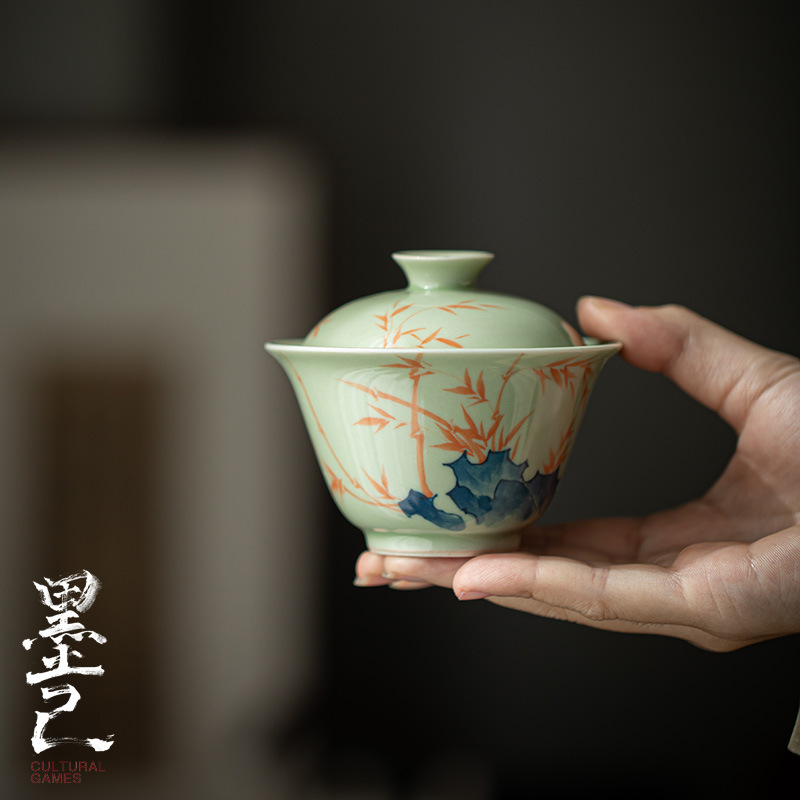 墨己秘青手描き蓋碗投口家庭用陶磁器茶碗太湖石紅竹粉彩文人泡茶碗