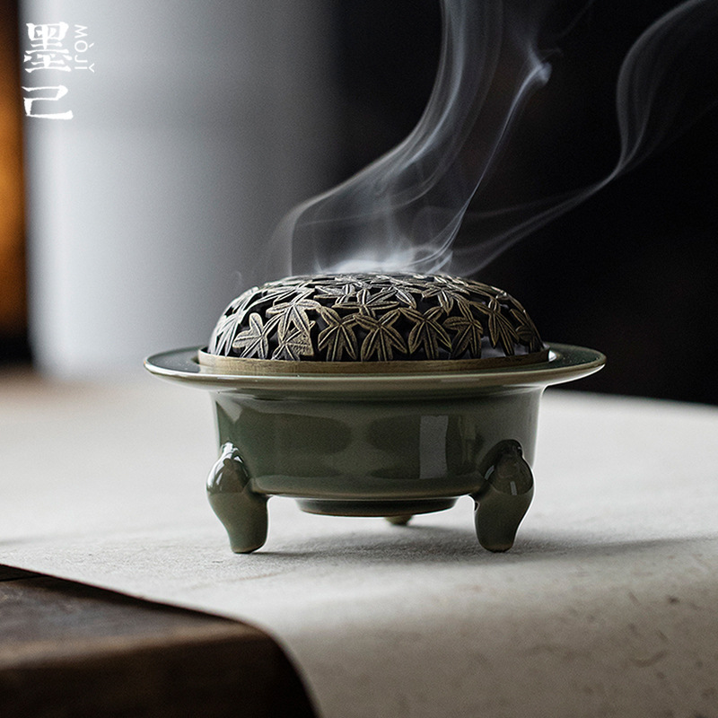 Moji 越窯青磁セラミック香炉家庭用屋内香アクセサリー香篆香三脚炉香炉