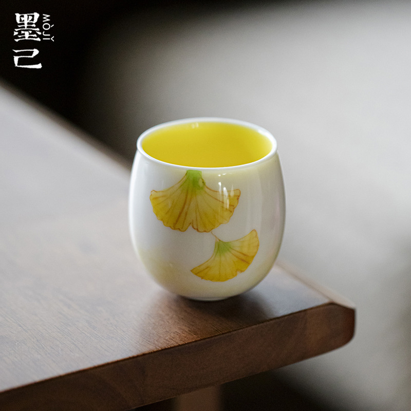 墨己玉泥白磁器手描きイチョウ陶磁器カップ工夫茶器家庭用お茶カップ