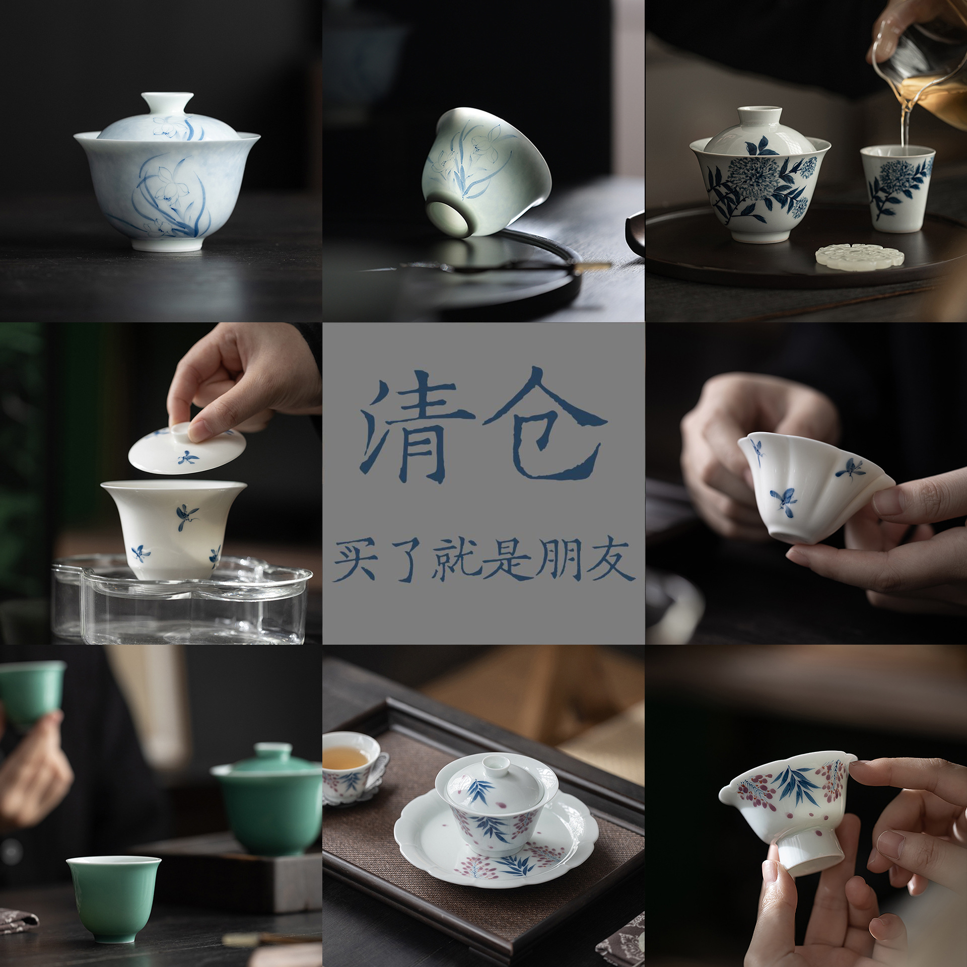 墨己玉泥藍影ベゴニア手描き工夫茶器陶磁器蓋碗ティーポット承茶道部品合集