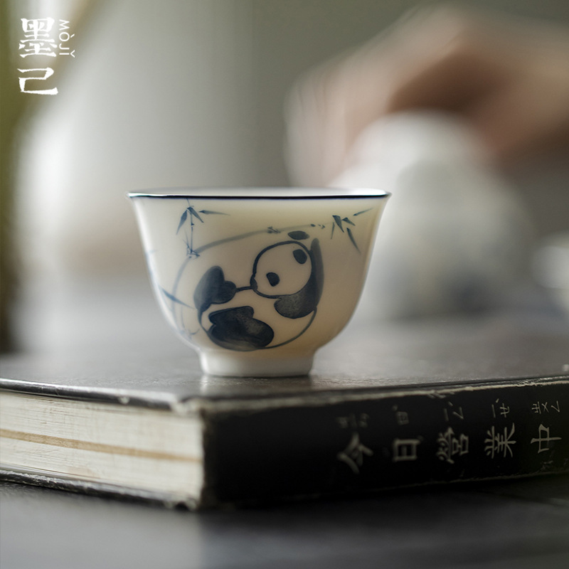 墨己手描き青花パンダ芝居竹陶磁器品茗杯工夫茶器陶磁器家庭用お茶カップ
