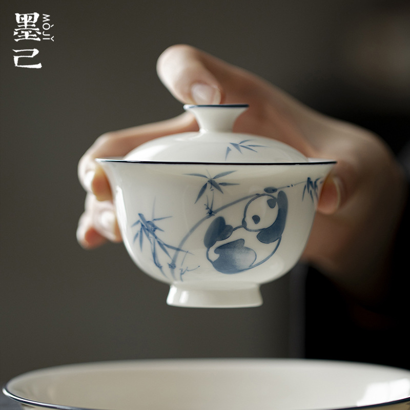 墨己玉泥白磁器手描き青花パンダ芝居竹蓋碗工夫茶器陶磁器家庭用文人泡茶蓋碗