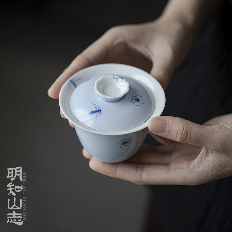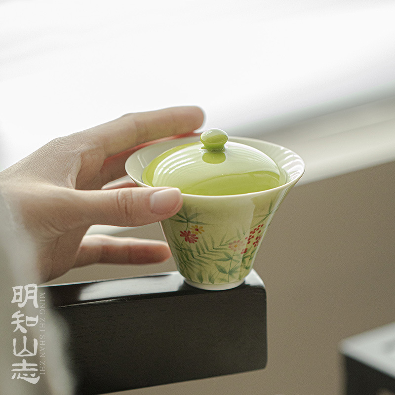 明知山志艾緑水仙気韻青時蓋碗手描き文人器家庭用蓋碗工夫茶道具碗