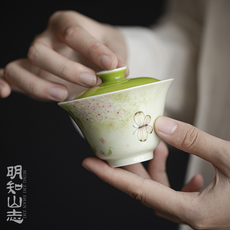 明知山志翠花叢小蝶凡霊蓋碗手描き蝶陶磁器蓋碗文人器家庭用茶器