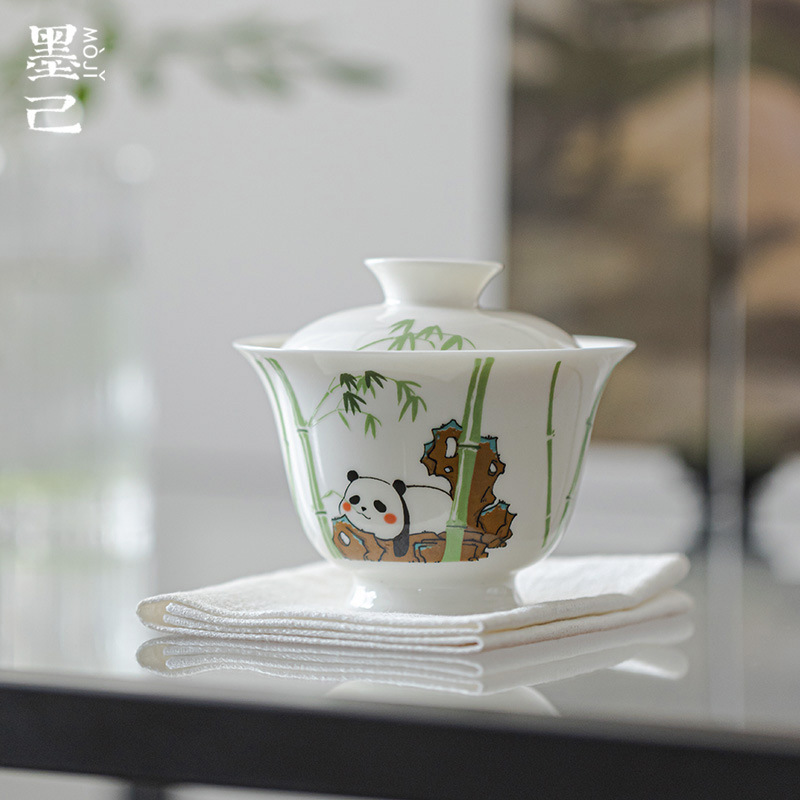 墨己盧清徳デザイナーパンダシリーズ玉泥白磁蓋碗薄胎茶具家庭用お茶碗