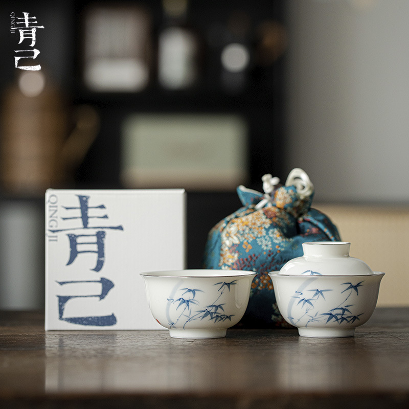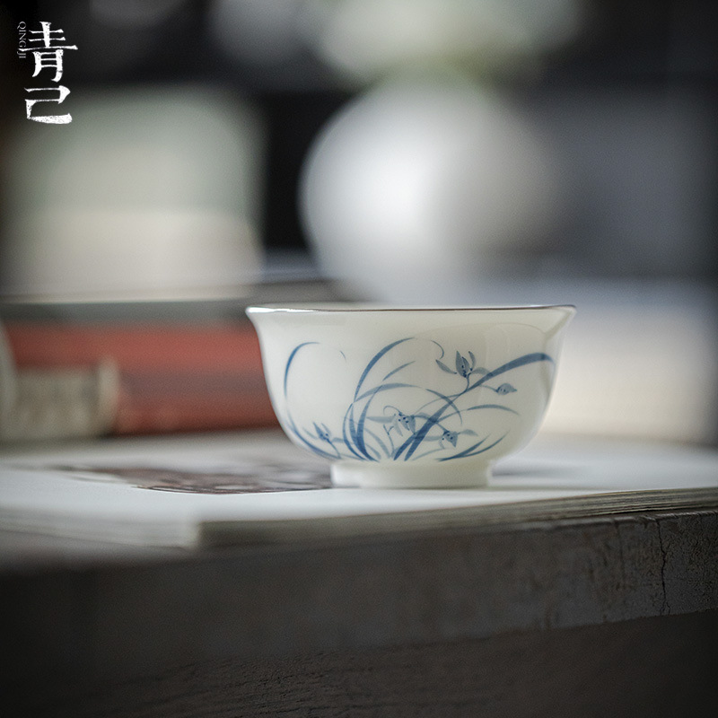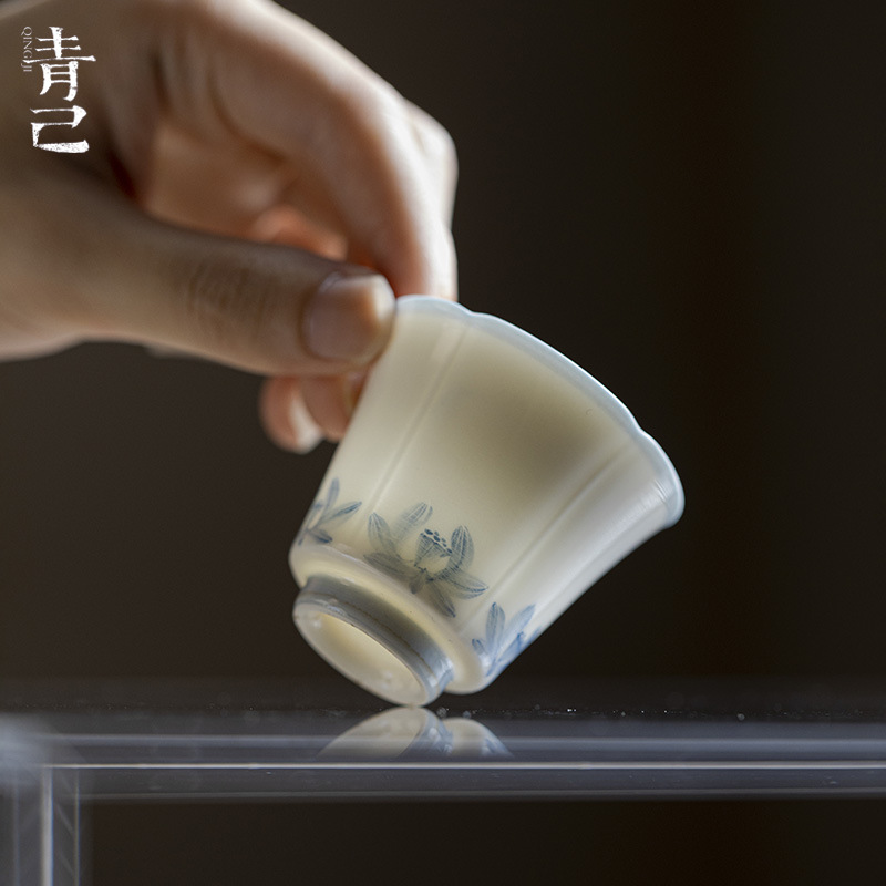 青己玉泥白磁器手描き竹青花主人杯家庭用陶磁器釉薬でお茶を飲むシングルカップ文人カップ