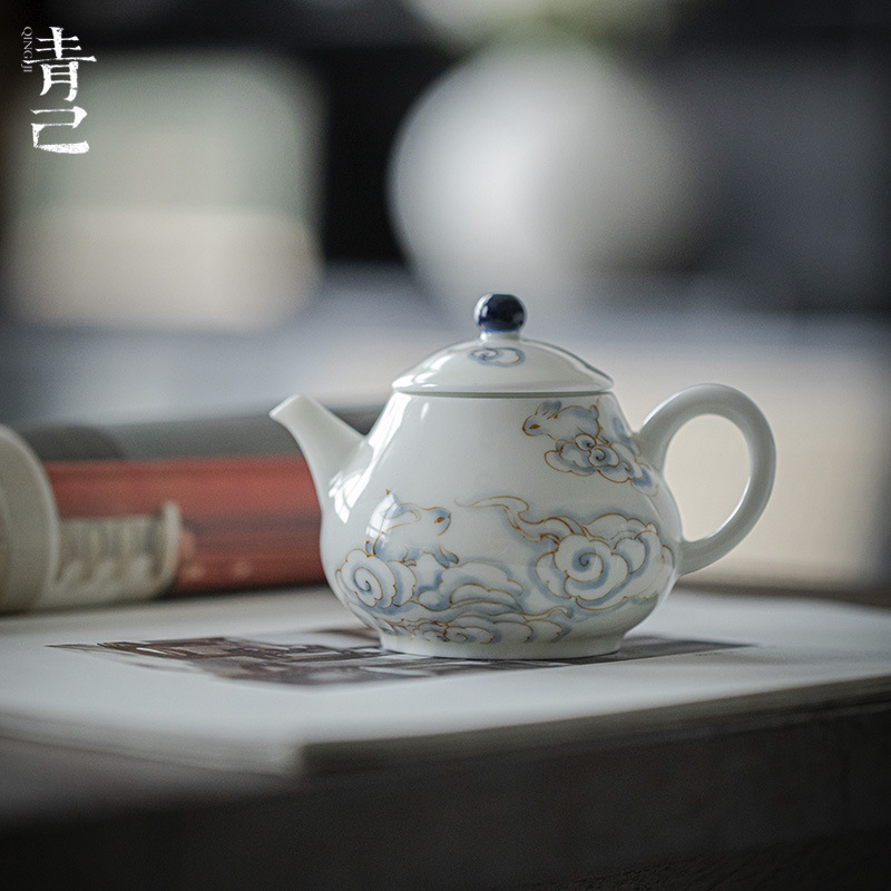 青己手描き青花ティーポット工夫茶道具陶磁器泡ティーポットボール穴ろ過家庭用瑞兎踏祥雲