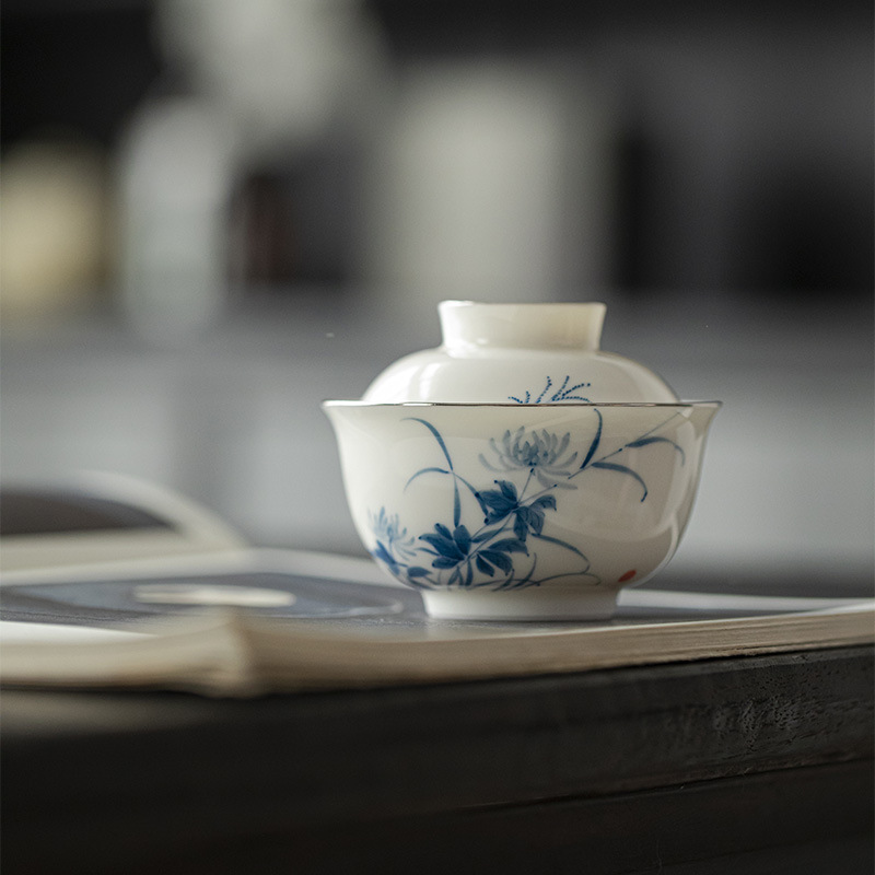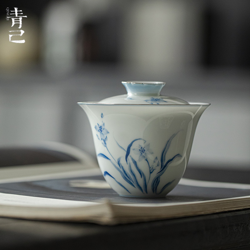 青己玉泥白磁器手描き青花蓋碗工夫茶器釉薬下彩家庭用泡茶玉蘭蓋碗