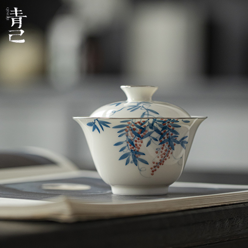 青己手描き青花蓋碗工夫茶器家庭用陶磁器泡茶碗文人器紫藤思悠蓋碗