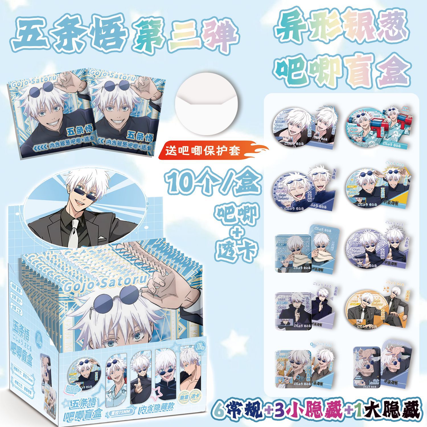 六条悟 銀葱バジ盲抽 107x96x107mm 75mmアニメ缶バッジ10枚入り ダブルフラッシュ