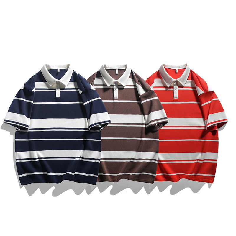 250g珠地綿poloシャツメンズ夏新作色合わせストライプ折り襟半袖tシャツストレッチ通気性トップス
