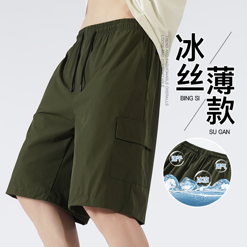 男性の香港風のスポーツの半ズボンの夏の新型の氷の糸の多ポケットの工装のズボンの弾力性の薄い金の速乾の5分のズボンの潮