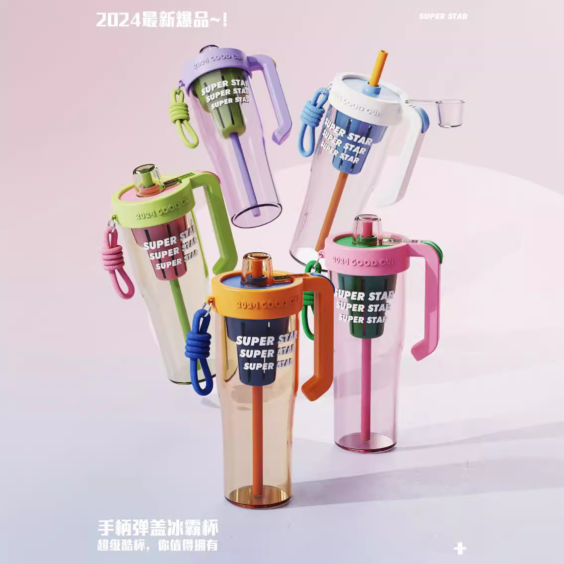夏の爆発金高颜値氷覇カップハンドル弾蓋随行カップ大容量耐高温プラスチックカップ屋外カップ