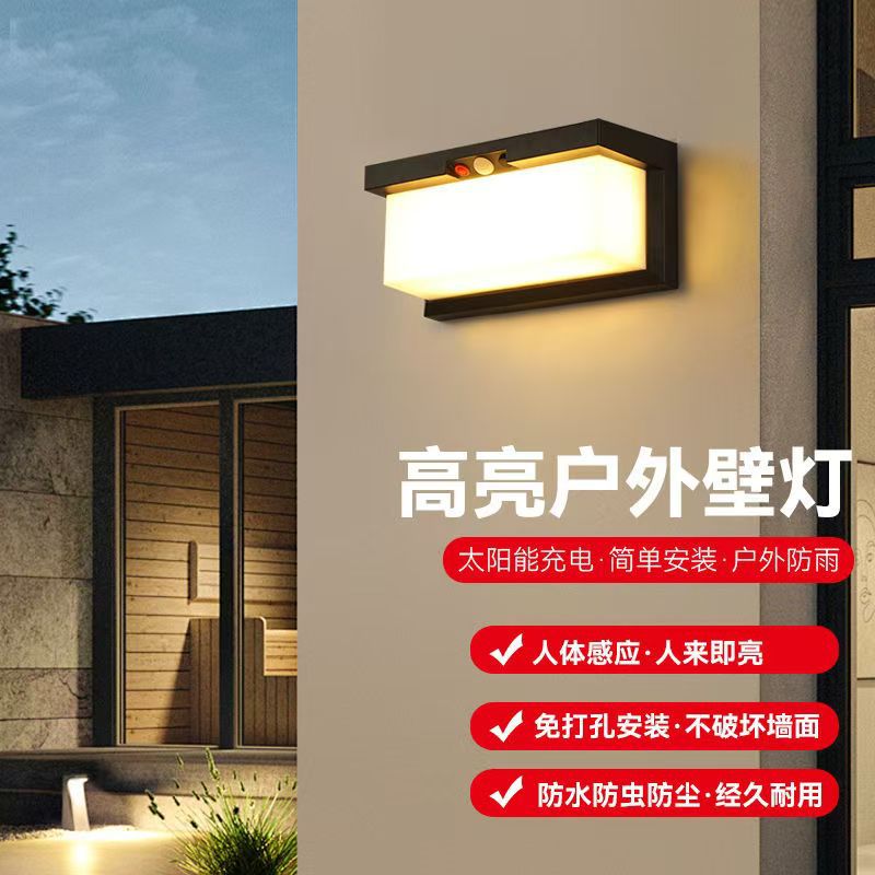 ソーラー壁灯防水穴なし角型シンプルな外壁庭灯ベランダ配線なし人体誘導壁灯