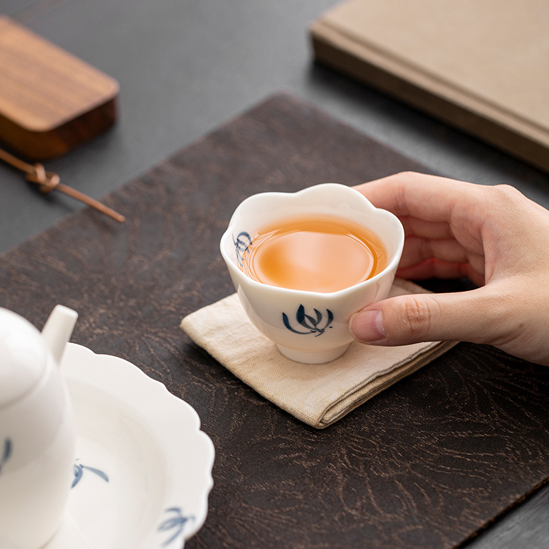 白磁の蘭の公道の杯の工夫の茶器の日本式の手描きの家庭用の熱防止のハイエンドの小さいサイズの茶器はお茶を入れて碗を覆います。