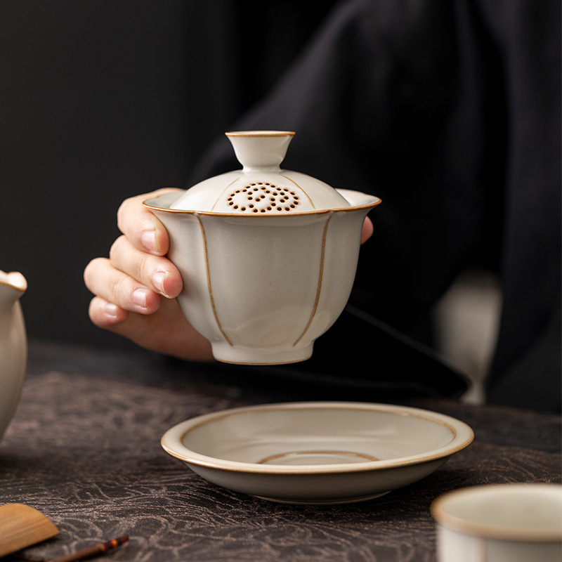 米黄汝窯三才蓋碗茶杯日本式陶磁器家庭用の単一の防熱手の小さいサイズの茶器の工夫茶器