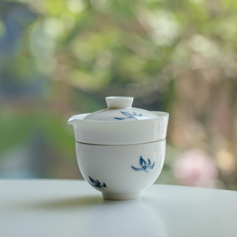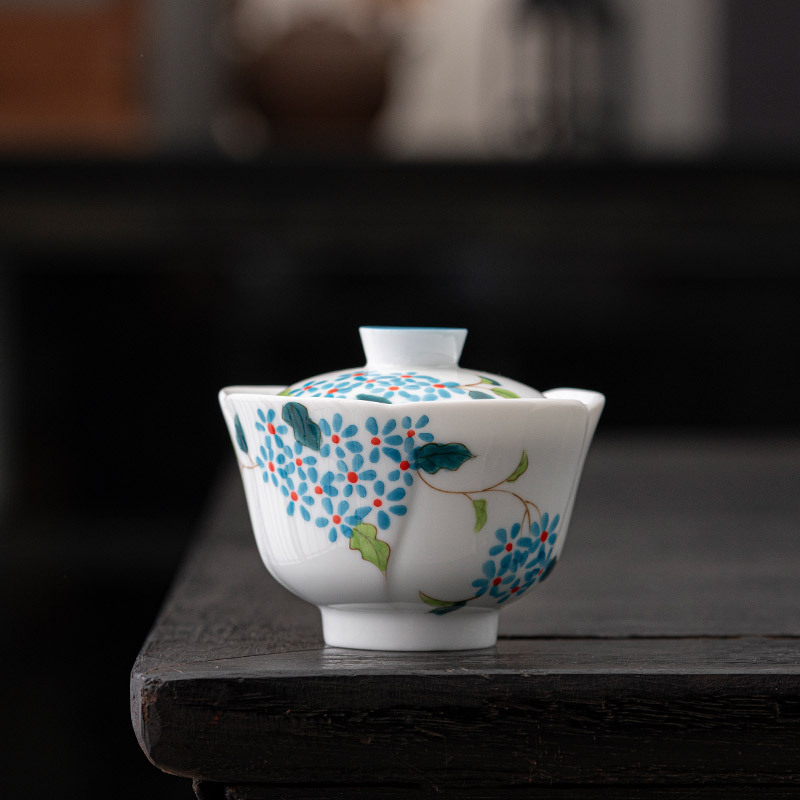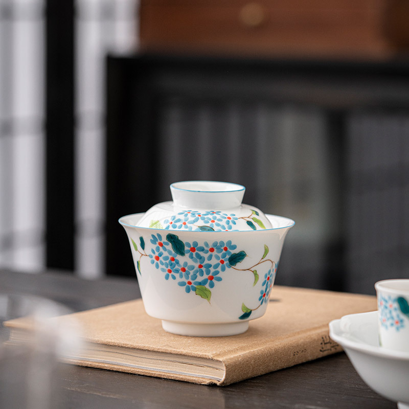 白い磁器の手描きの花の三才は碗をかぶせます。