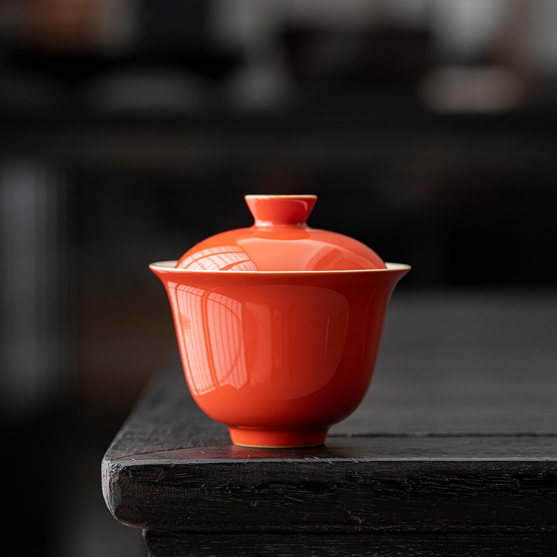 故宮の赤い蓋の碗のお茶の杯の復古の陶磁器の工夫の茶器の家庭の単一の2才の茶碗の釉薬の下で色をつけてお茶を入れて碗を覆います。