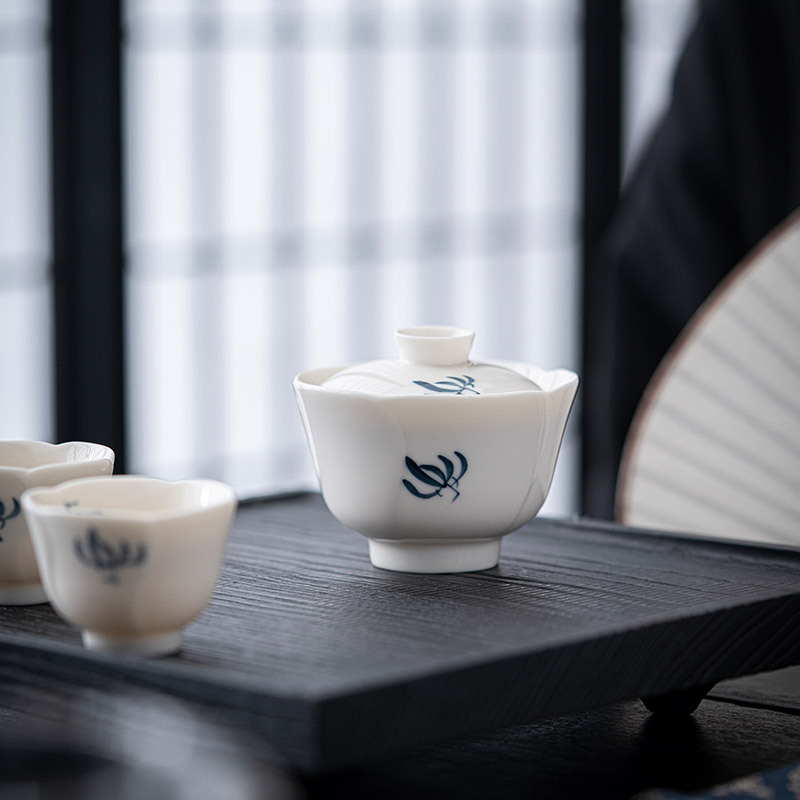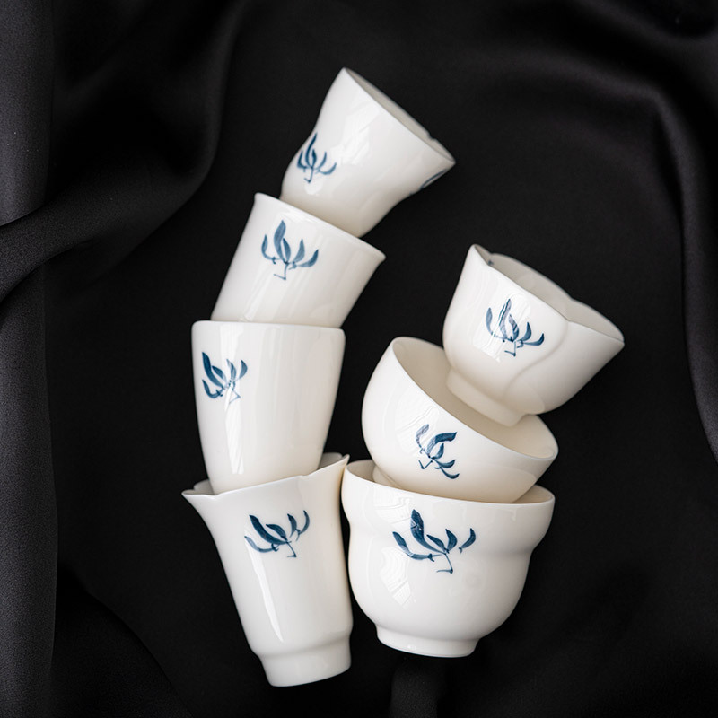 白磁の手描きの蘭のトランペットの陶磁器のお茶の杯の白茶の個人のコップの工夫の茶器のプーアル緑茶の小さい茶碗
